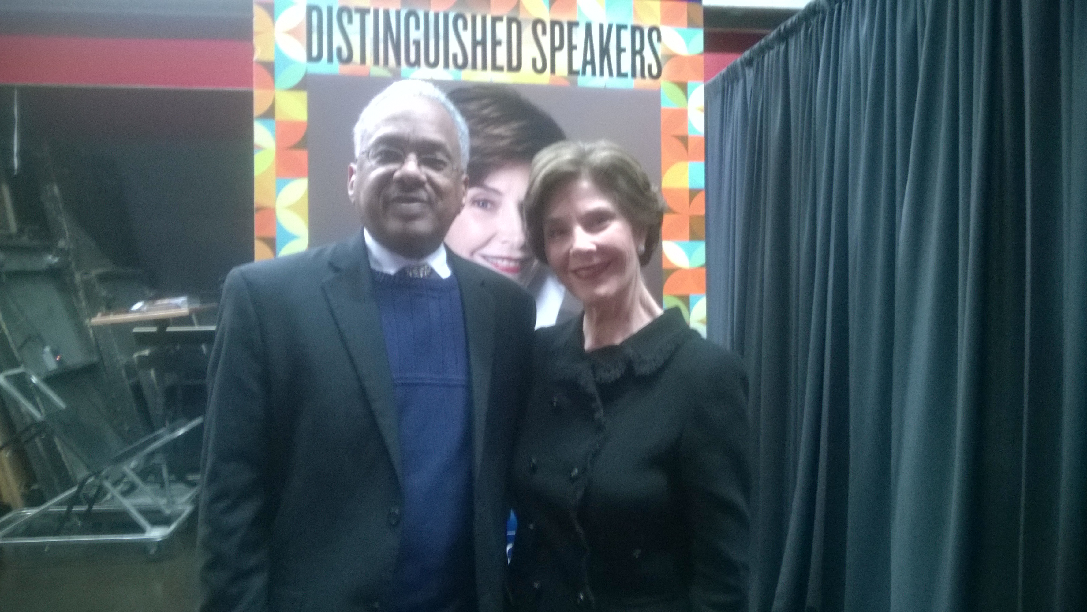 During our Q&A session, I asked Mrs. Bush about the work of the Bush Institute, which is the vehicle that she and former President George W. Bush are using to do a number of initiatives to improve the lives of people in this county and abroad. I asked Mrs. Bush about an announced President Bush made a few days earlier that the Bush Institute would be working hard to get employers to get serious about hiring veterans of Iraq and Afghanistan. It’s shameful, I told Mrs. Bush about the unemployment rate of our veterans. She agreed sand said that this new Bush Institute Initiative for veterans is something she and her husband feel very strongly and deeply about. Another subject they both deeply hold is the Bush Institute’s work to fight disease and HIV/AIDS in Africa. It’s an initiative Mr. Bush began as President and it continues after he left the White. I told Mrs. Bush and the Clowes Audience that the Bush’s work in Africa isn’t much noticed by media in this country. She talked passionately about their work in Africa and how much it means to the people of those nations and to them. As a grandfather, I asked her about being a new grandmother and her granddaughter Mila (who was born to daughter Jenna and her husband Henry Hager). As any new grandmother she talked glowingly about granddaughter Mila and how much her husband dotes on her. But I used the question to also get Mrs. Bush’s views on the growing number of grandparents who are primary parents of their grand children today. Throughout the Q&A, Laura Bush’s down to Earth manner, her humor, her positive personality showed through. In a question about advice from former First Ladies, Mrs. Bush told a story of something Hillary Clinton told her. Mrs. Clinton said, “You know, when you get an opportunity to do something, don’t think ‘Well I’m too busy to do that,'” . That led to a story of Mrs. Clinton getting an invitation from Jacqueline Kennedy Onassis. Mrs. Clinton begged off saying she was too busy. Mrs. Onassis died shortly afterwards. Mrs. Bush said the advice from Hillary Clinton was “to not think we’re too busy to miss an opportunity like that.” She had the audience in stitches talking about her husband’s new penchant for painting. And she revealed that the George W. Bush Library will be displaying a collection of Mr. Bush’s paintings this Spring. Mrs. Bush thought she was telling something that hadn’t been made publicly, but I told her I’d learned about it backstage on my smartphone and that the word was already out. The final question was “What did she like best about the White House”? To laughter Mrs. Bush said “The Chef”. Then she talked nostalgically about the staff at the White House, from florists, to carpenters to electricians to the butlers. Then she said that when she left Indianapolis she was going to Washington “to attend the funeral of a butler who had served her (and President Bush) and went back to the Reagan years”. There was a poignancy in Mrs. Bush’s voice as she talked about the service this White House butler and others had given. At that moment the compassion that is Laura Welch Bush came through for nearly 2,000 in Clowes Hall to hear. I appreciated the opportunity to share the moment with Laura Bush. During the evening, VIP’s weren’t allowed to sneak a photo with her. But at the end of the evening before she left the Butler campus, Laura Bush graciously gave the OK for the photo you see at the top of this post. She is a remarkable, classy lady. I’m glad I had the privileged of sharing time with her.